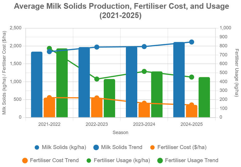 - Fertiliser Cost (NZ$/ha): Dropped from NZ$554 to NZ$350, a 37% reduction, due to reduced over-application.